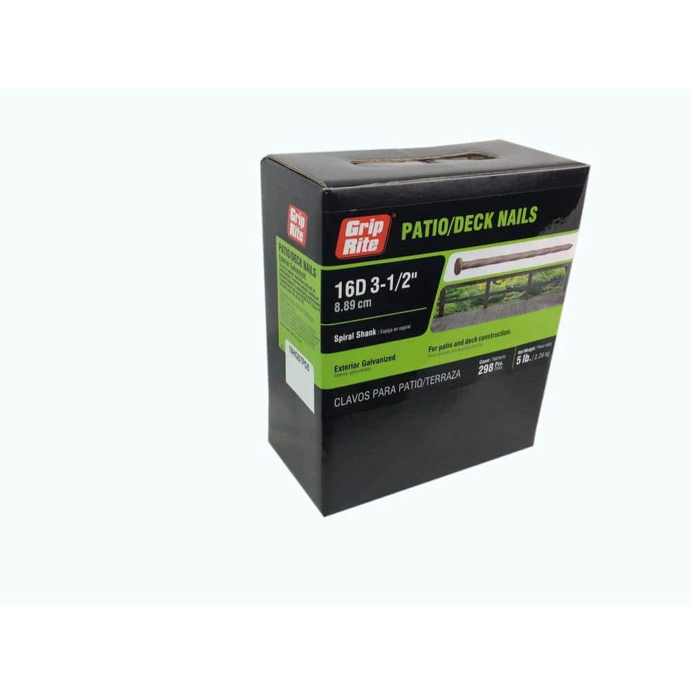 Grip-Rite hot dipped galvanized spiral thread nails are used for patio and deck construction. The spiral and ring shank provides greater holding power. The great holding power prevents the boards from going up and down and causing them to squeak.