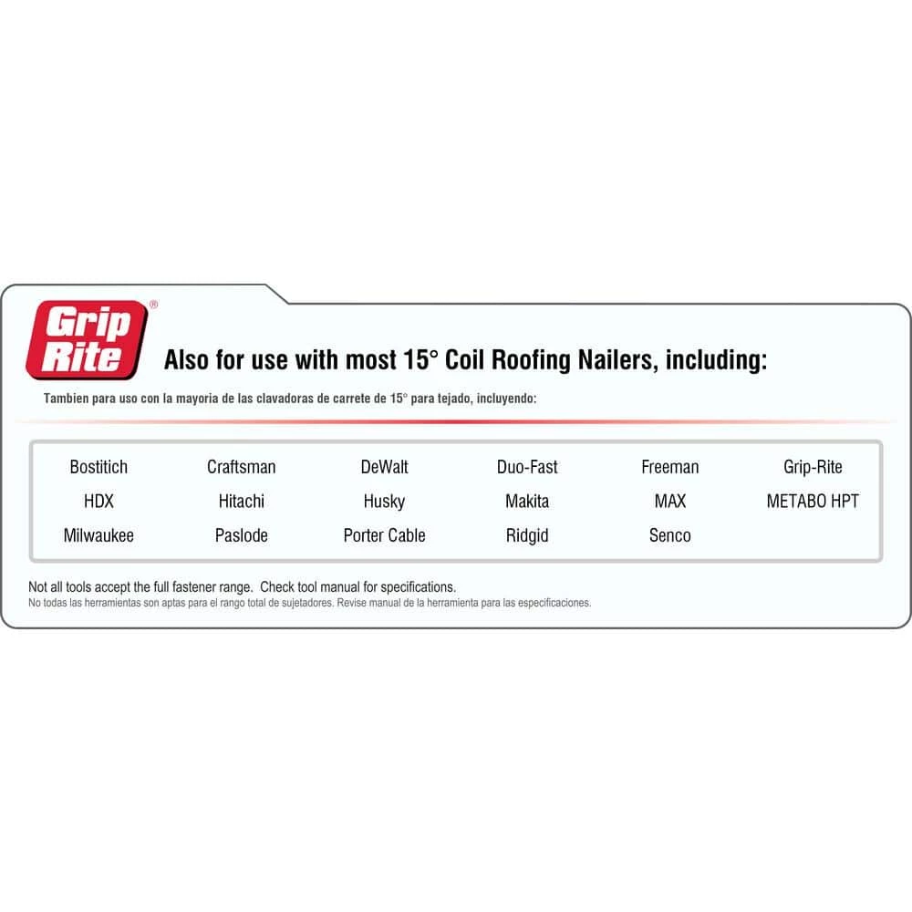 Use Grip-Rite Coil Roofing Nails with most power nailers when fastening shingles to roofs. The package contains 7,200 wire-collated galvanized steel nails that are resistant to weathering and rust. All Grip-Rite collated nails are backed by the Grip-Rite Jam Free Gurantee.