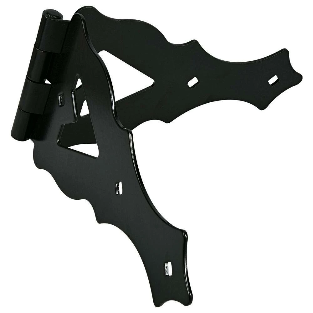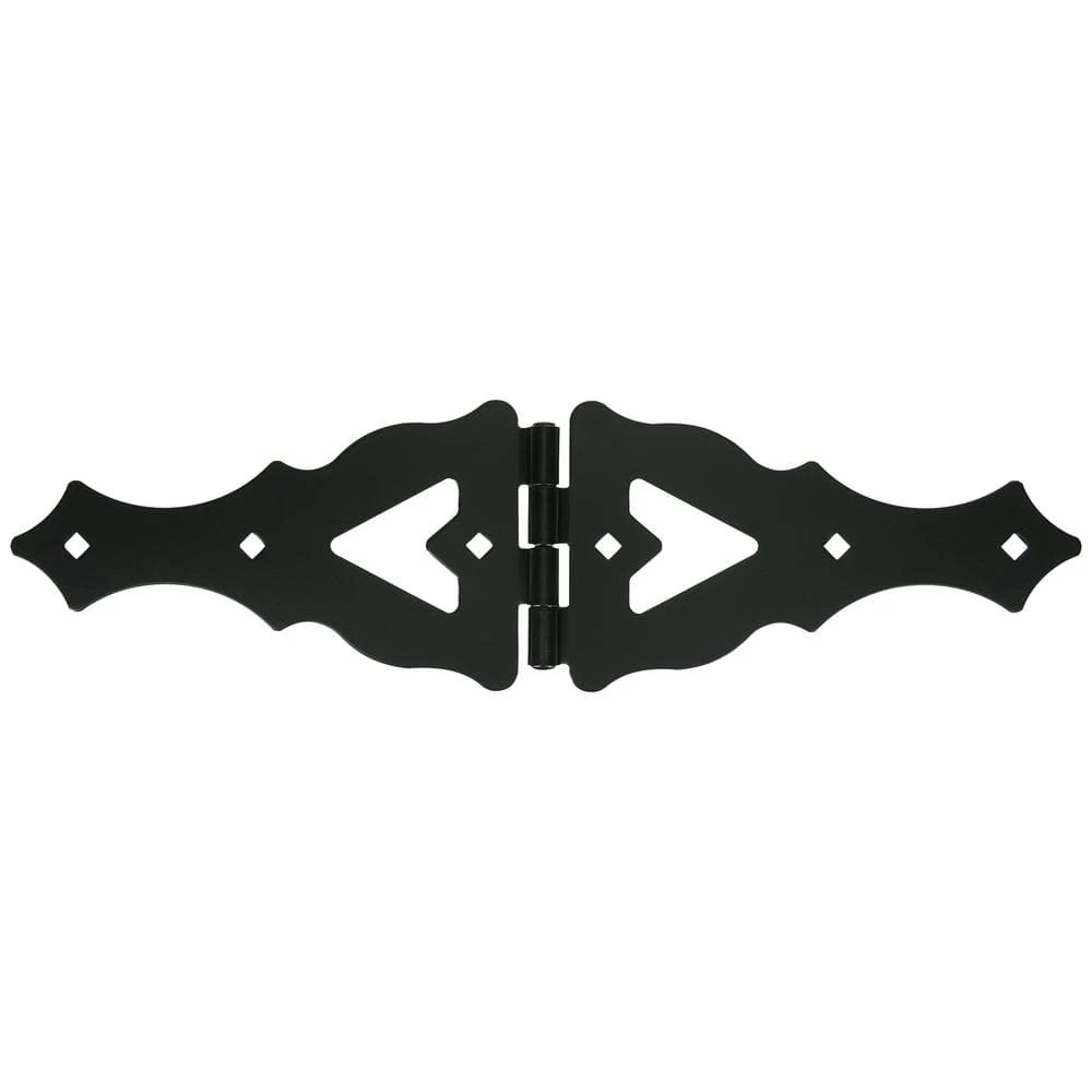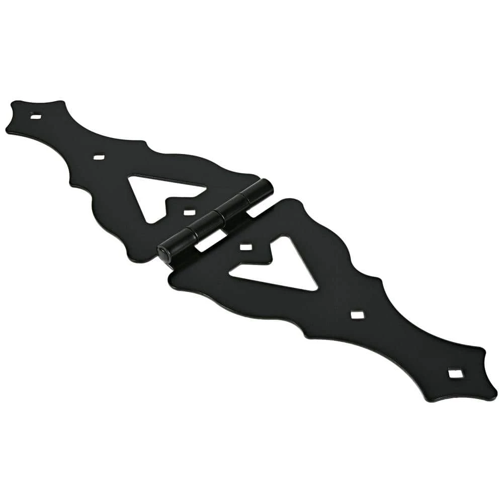 “Enjoy your exterior space with this four-pack of Hardware Essentials heavy-duty ornamental strap hinges. The strong steel construction with an attractive black finish combines stability with charm and sophistication for outdoor gates, shed doors and storage bins. Left-handed or right-handed installation is simple with a full mounting surface. These Hardware Essentials heavy-duty ornamental strap hinges have a fixed pin that stays in place for dependability and security.”